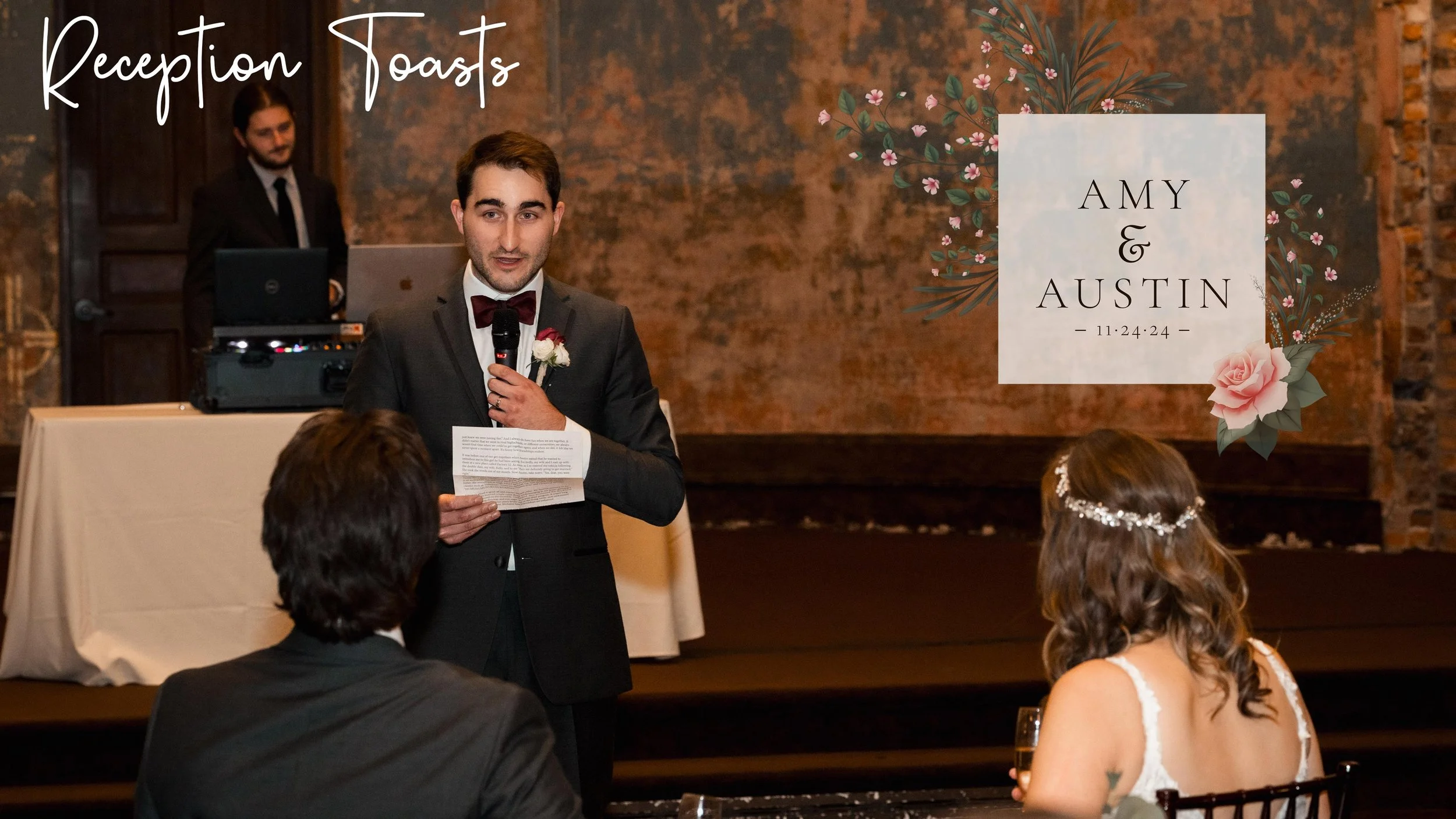 Amy's Maid of Honor and Austin’s Best Man give a reception toast, before Amy and Austin give a speech to the entire wedding reception.
